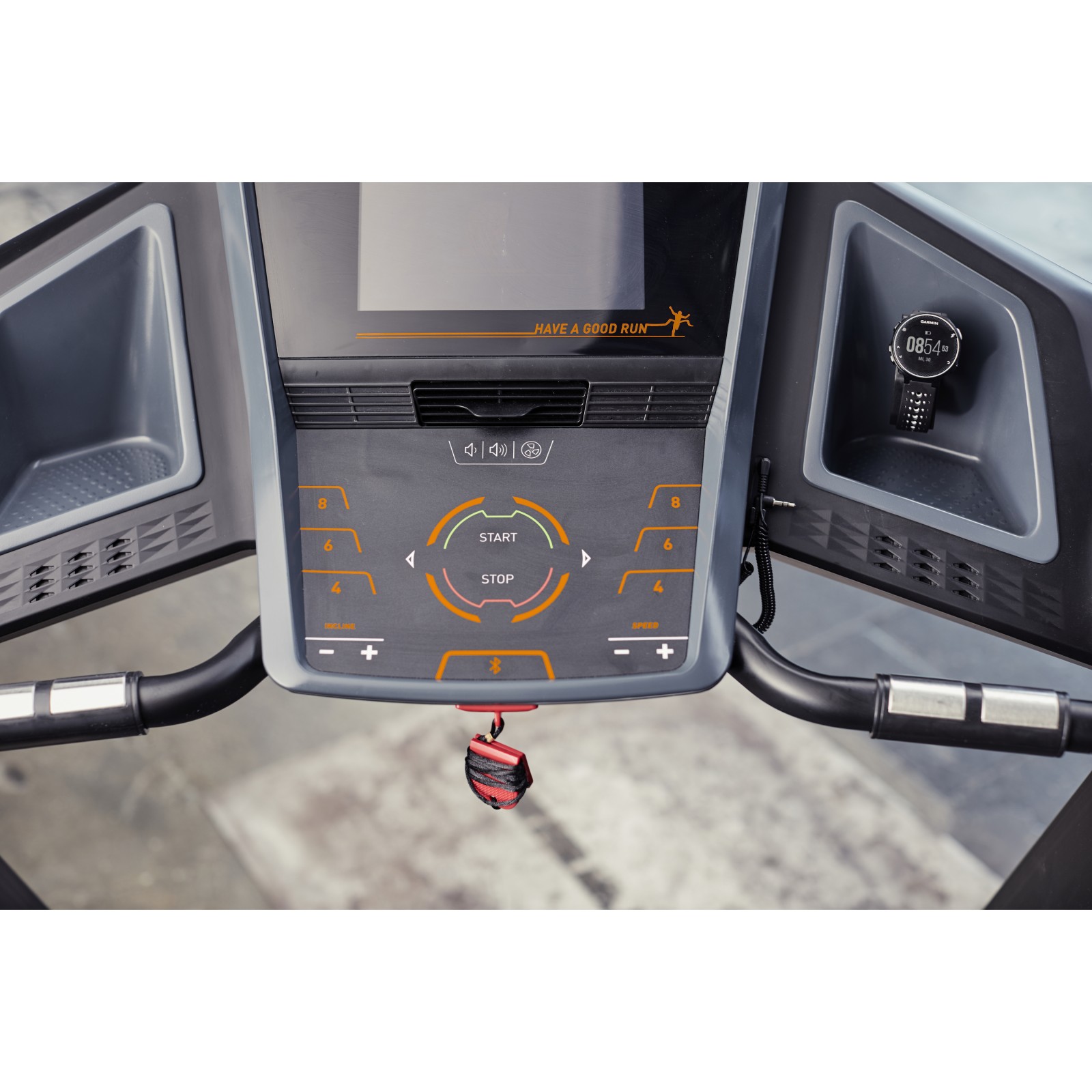 - Højttaler, tabletholder, ventilator og holder til sportsure medfølger