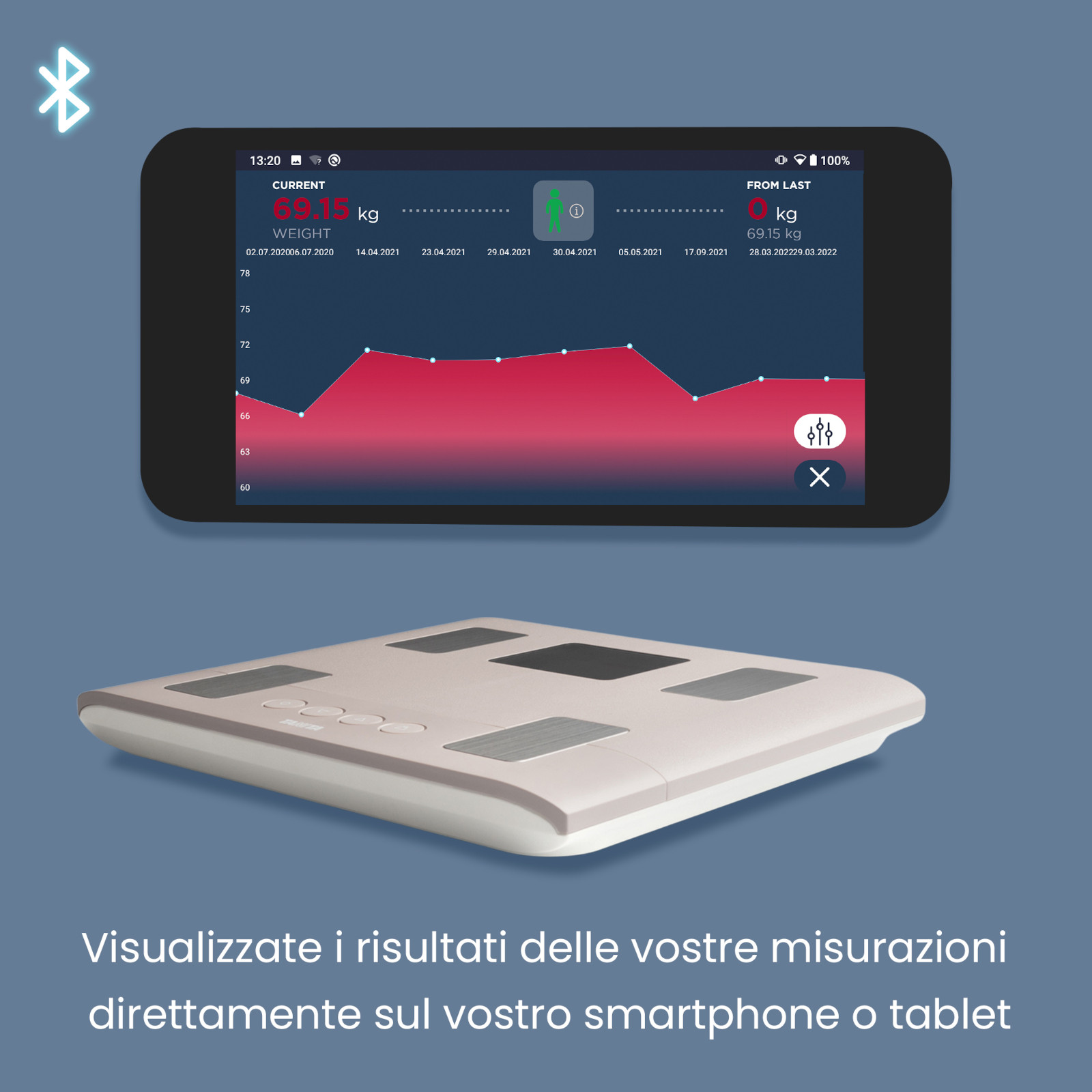 L'app My TANITA può essere facilmente collegata alla bilancia per l'analisi corporea, consentendo di visualizzare tutti i valori a colpo d'occhio. Questo ti permette di tenere sotto controllo il tuo sviluppo fisico e di avere sempre con te i tuoi risultati.Condizioni di garanzia: Bilancia Analitica Tanita BC-333LE