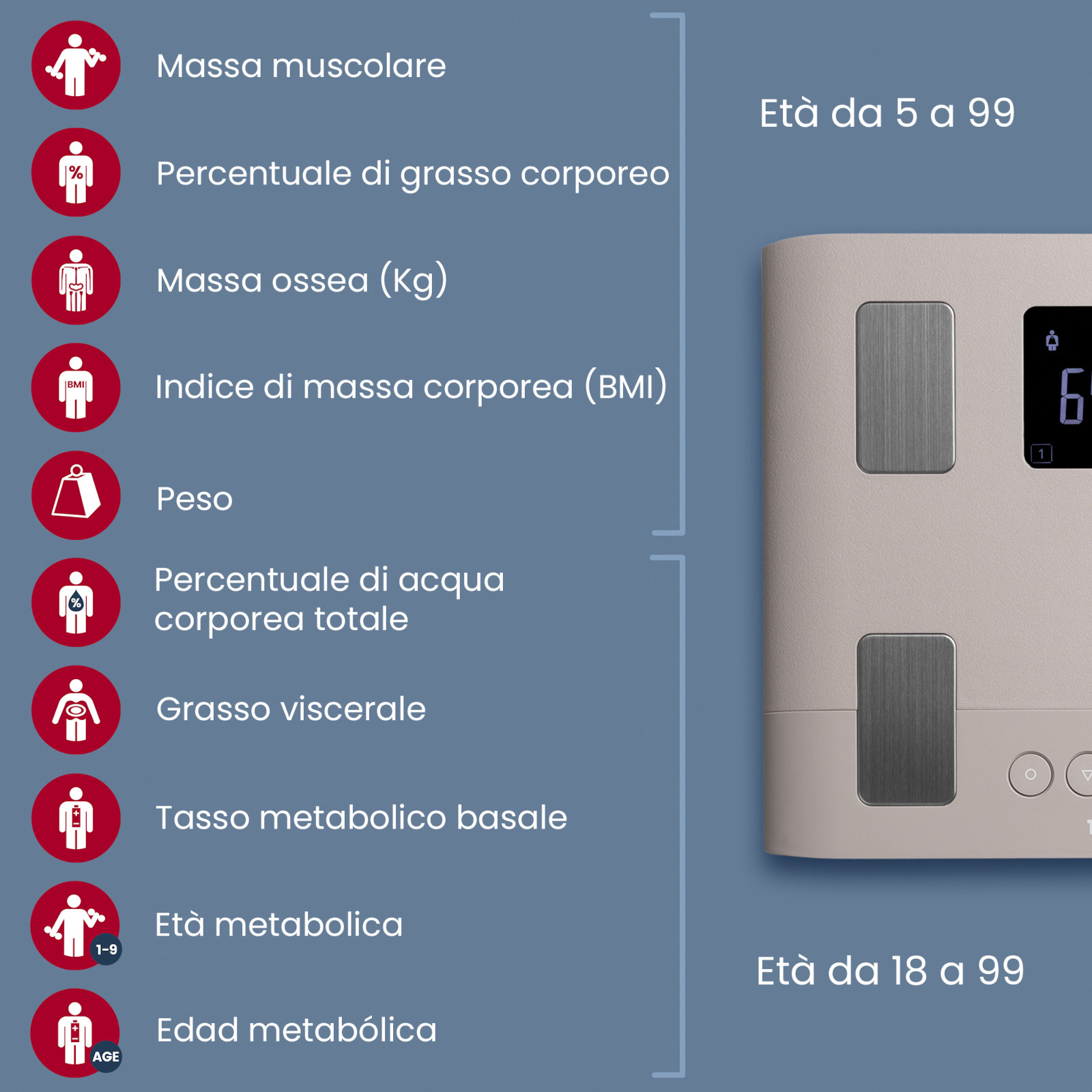 Il peso di una persona è il risultato di una serie di fattori, come la massa muscolare, la massa ossea, il grasso corporeo e l'acqua corporea. Con la Bilancia Analitica Tanita BC-333LE è possibile vedere esattamente come è composto il proprio peso. Con un totale di dieci diverse misurazioni, la bilancia fornisce un'istantanea completa di tutte le informazioni importanti sul tuo corpo e sulla tua salute.Valori misurati come il grasso corporeo e la massa muscolare, ad esempio, indicano se hai accumulato grasso o muscolo con l'aumentare del peso. L'acqua corporea, invece, è un buon indicatore delle piccole fluttuazioni di peso giornaliere, che spesso possono essere spiegate da questo dato. Le altre misurazioni forniscono anche un'indicazione del tuo stato di salute attuale: a questo scopo vengono utilizzati l'età metabolica e il punteggio corporeo. Il tasso metabolico basale aiuta a definire gli obiettivi calorici giornalieri per raggiungere i tuoi obiettivi.