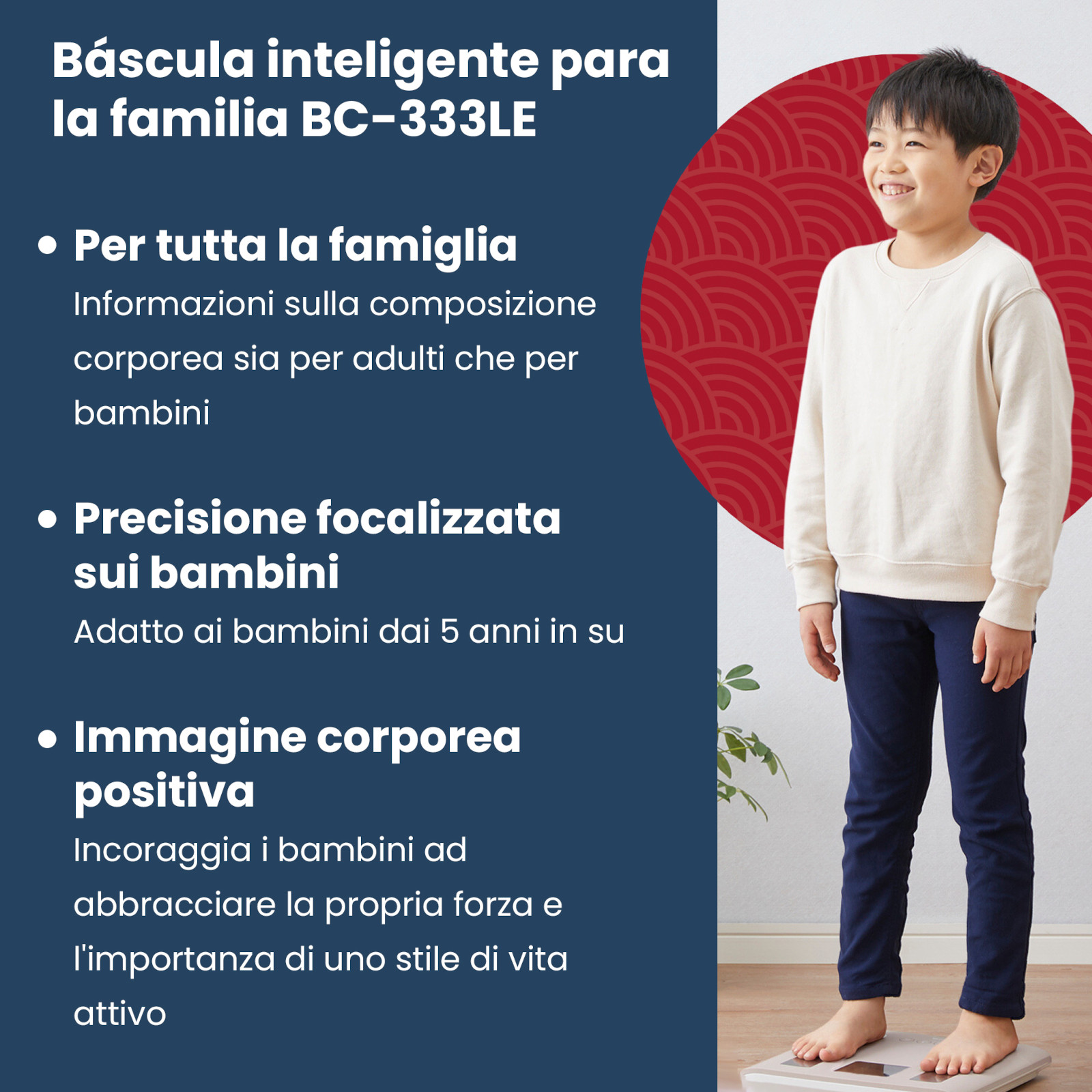 Per i tuoi bambini (a partire dai 5 anni), la Bilancia Analitica Tanita BC-333LE mostra solo gli indicatori di salute più importanti: peso, IMC, massa muscolare, massa ossea e grasso corporeo. In questo modo puoi assicurarti che il tuo bambino cresca sano e prepararlo a uno stile di vita sano attraverso il gioco.Tutto a colpo d'occhio con una sola app