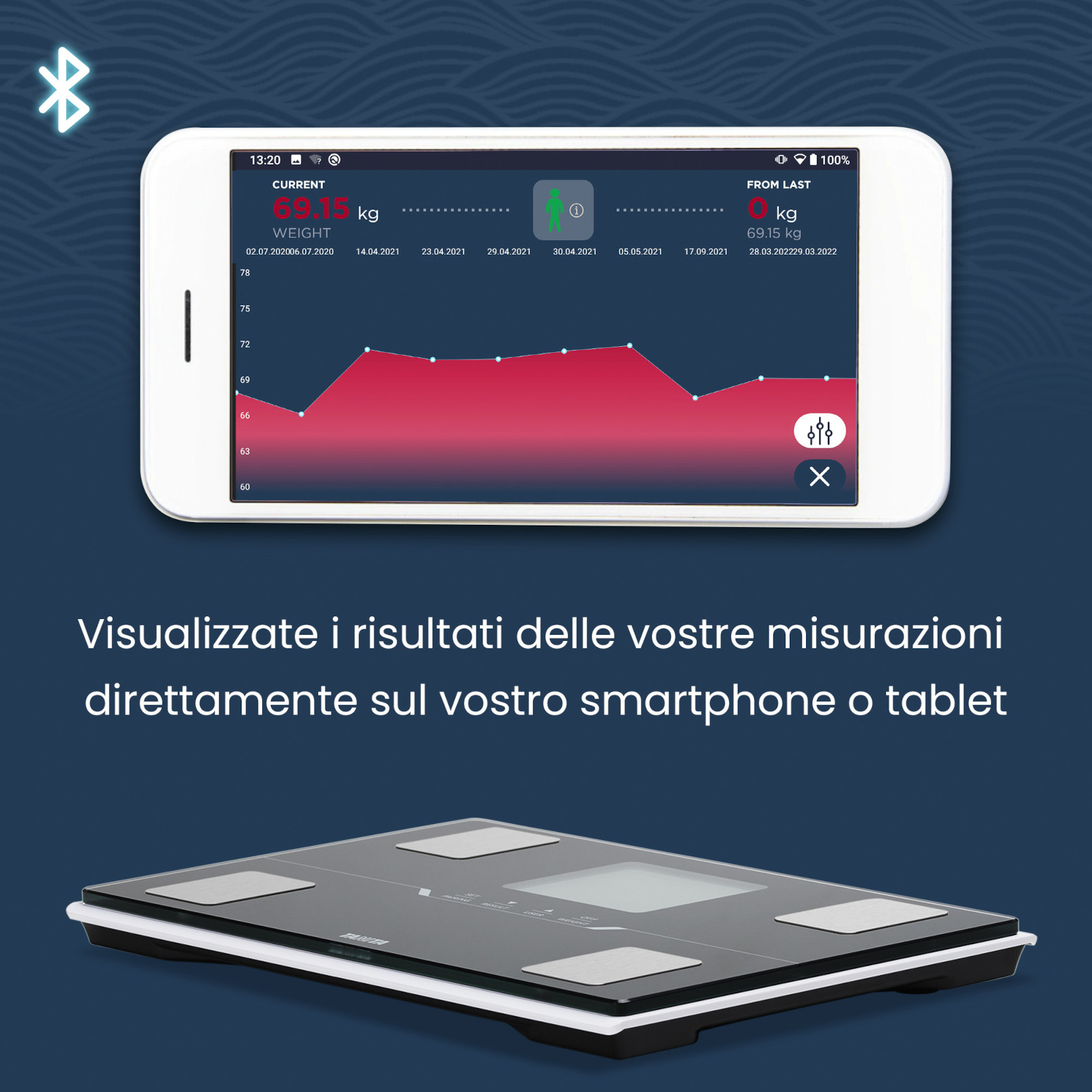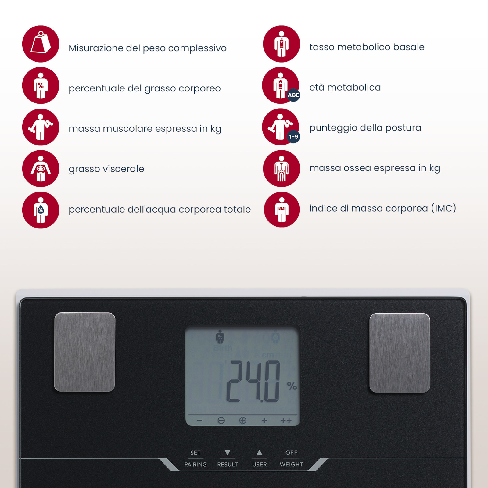 - Analisi della bioimpedenza con 4 elettrodi a piede e a 2 frequenze - per una misurazione affidabile